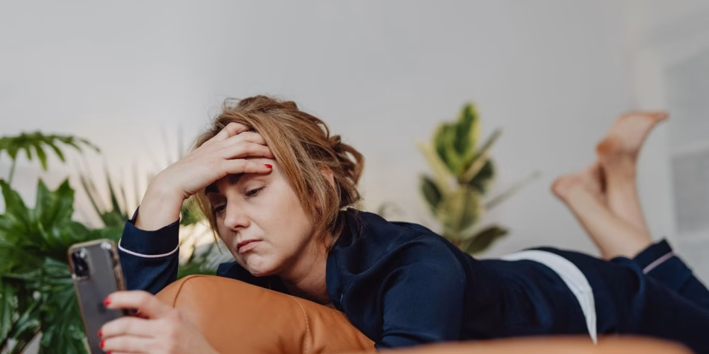 Woman lying down looking at a phone, appearing stressed